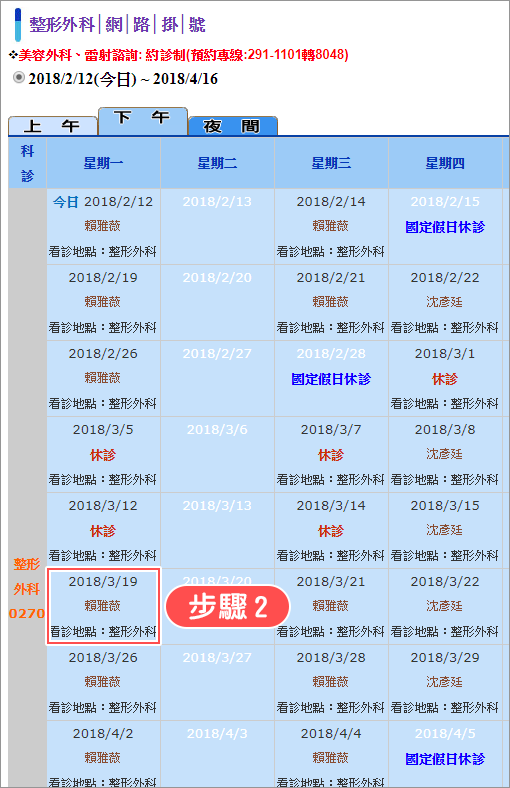 步驟2:點選欲掛號的日期、時段及醫師。