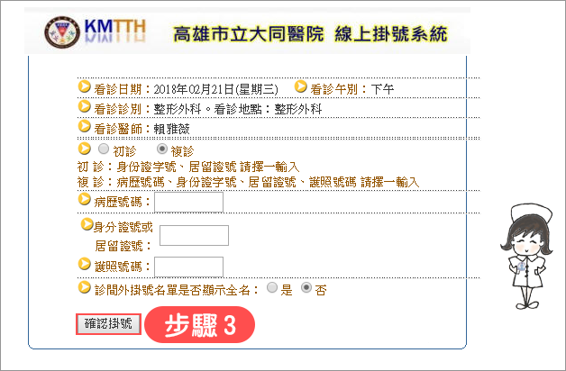 步驟3:填寫資料後點選「確認掛號」即可完成掛號程序。
