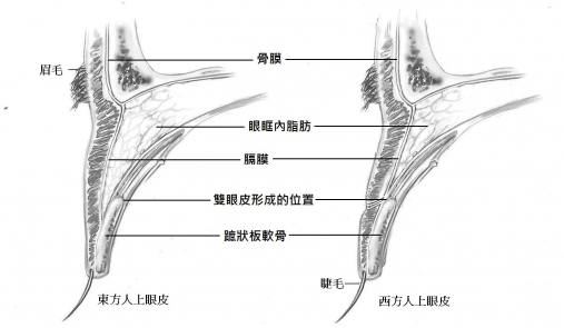讓我們先來瞧瞧東方人與西方人的上眼皮構造: