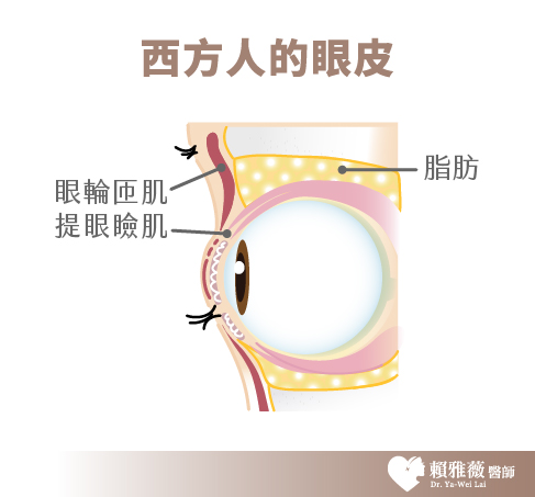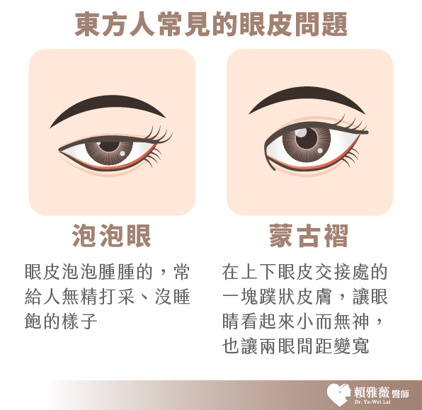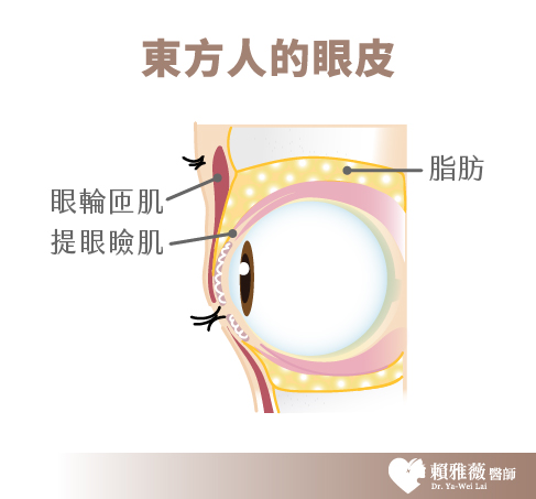 由於東方人與西方人從眼球構造就有所不同,因此雙方的眼皮在外觀上就有所差異。東方人因為眼窩脂肪較多、眼皮的肌肉較厚、提眼瞼肌與肌肉不相連的關係,加上眼睛較突出之故,所以在眼皮肌肉張開時,只能夠提起眼窩中隔與脂肪,無法帶動眼皮,所以東方人才會有較常見的單眼皮或內雙,多數人還合併有泡泡眼的情形。