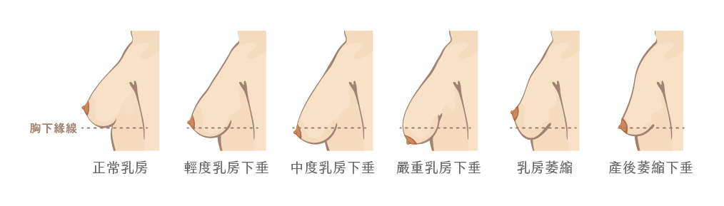 有巨乳或乳房下垂困擾的患者,皆可諮詢縮胸手術治療,但建議最好在乳房完全發育後再進行手術,因為在縮胸手術時會移除大量的乳房組織,可能會影響到日後的哺乳功能,患者術前需要與醫師一起評估手術的利弊,審慎選擇適當的做法。若是因為產後或哺乳產生的乳房下垂,建議先由專業醫師評估下垂的程度。依照乳頭和乳暈的位置,乳房下垂約可分為4級(如下圖),手術矯正的方式必須按照乳房下垂的嚴重程度來做選擇,因此術前的詳細評估是相當重要的。而乳房下垂的患者也可以同時進行提乳和縮胸手術,因此術前可以將需求一併告知醫師,讓醫師將縮胸也列入手術規劃內。